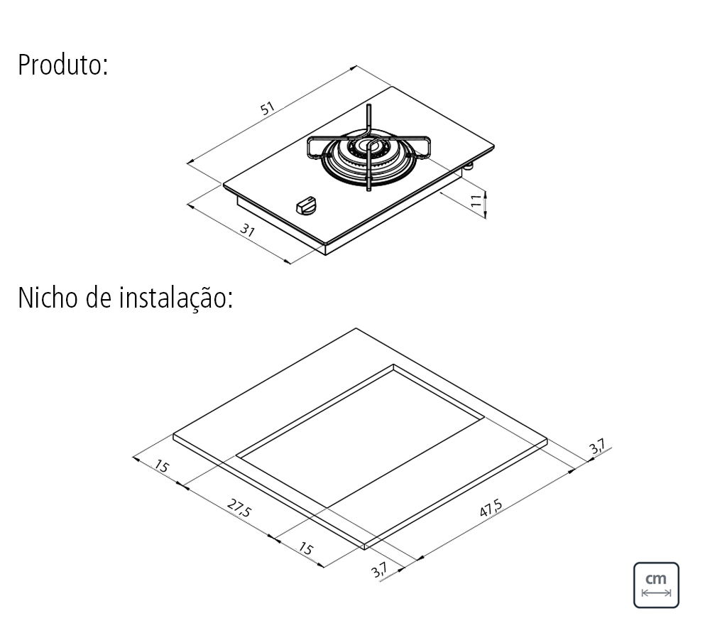 - Manípulo em baquelite: material resistente ao calor, garantindo sua segurança e conforto ao utilizar o cooktop.