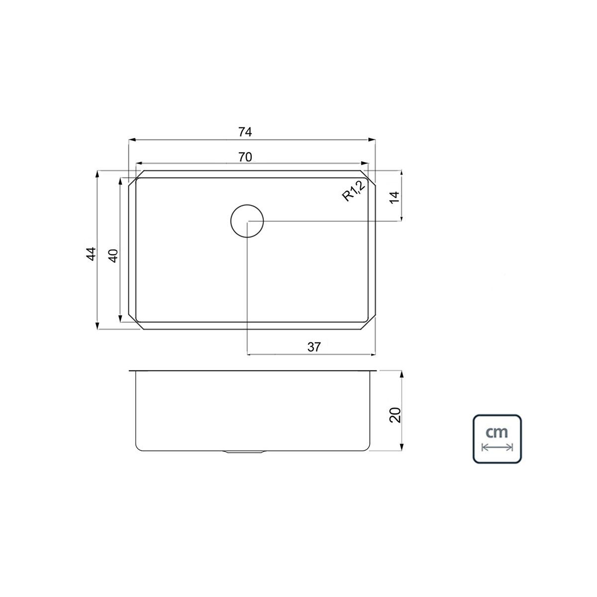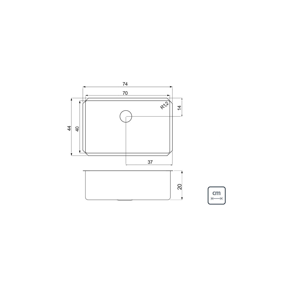 Cuba em aço inox AISI 304 com 1mm de espessura e acabamento acetinado. Cuba com 205 mm de profundidade. Raio interno da cuba de 12 mm.