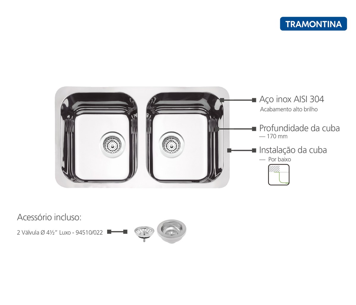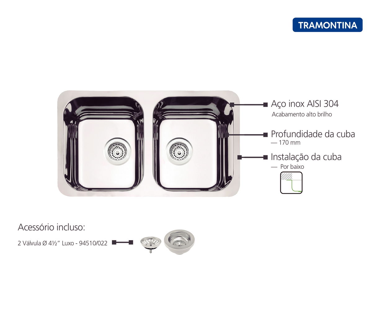Cuba de embutir Tramontina Isis Plus 2C 34 BL em Aço Inox Alto Brilho