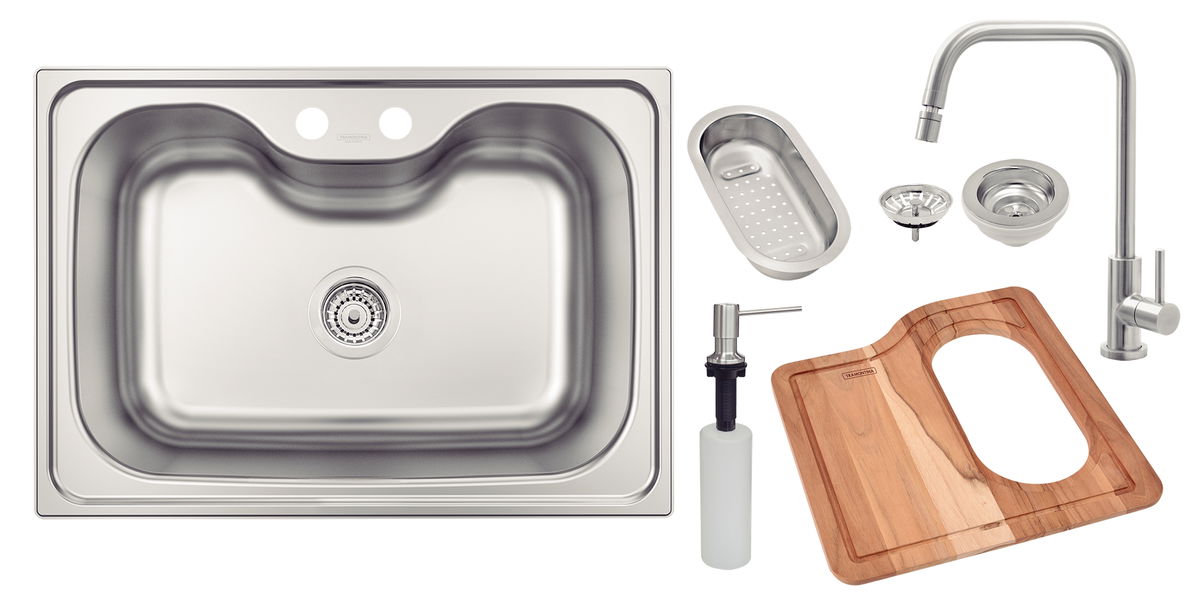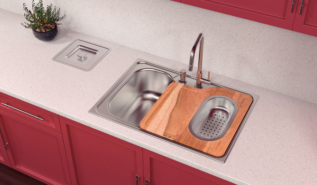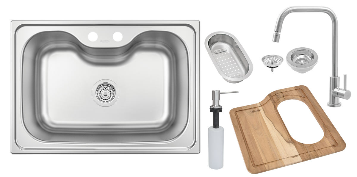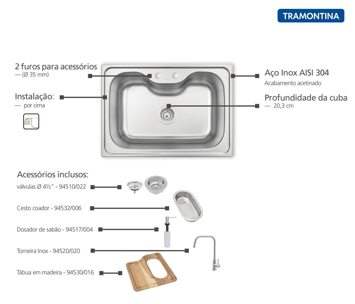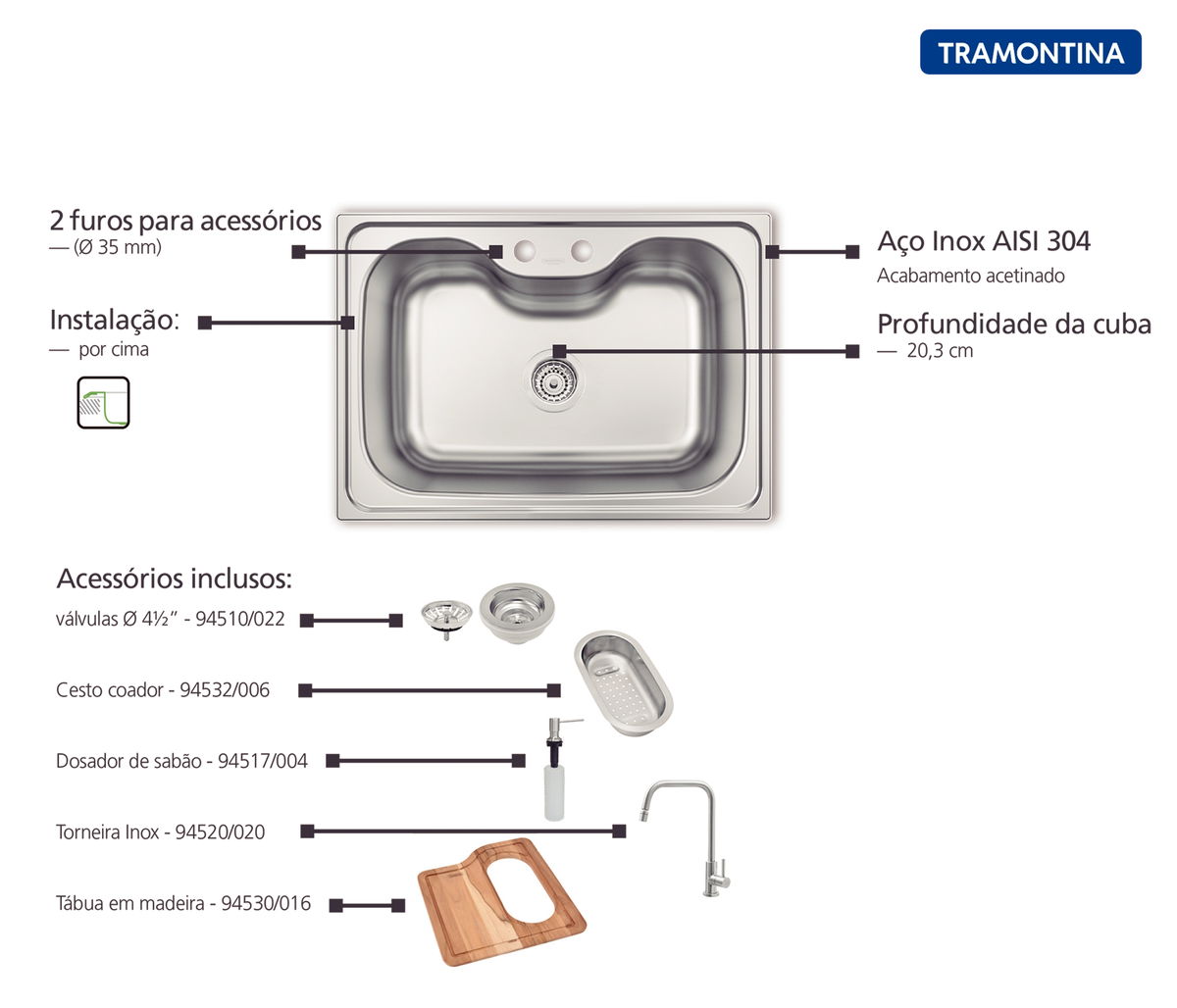 Surpreenda-se com o estilo e o design da Cuba de Sobrepor Tramontina Morgana em Aço Inox com Acabamento Acetinado 69 x 49 cm com Torneira, Válvula, Dosador de Sabão, Tábua e Cesto coador, da linha Prime.