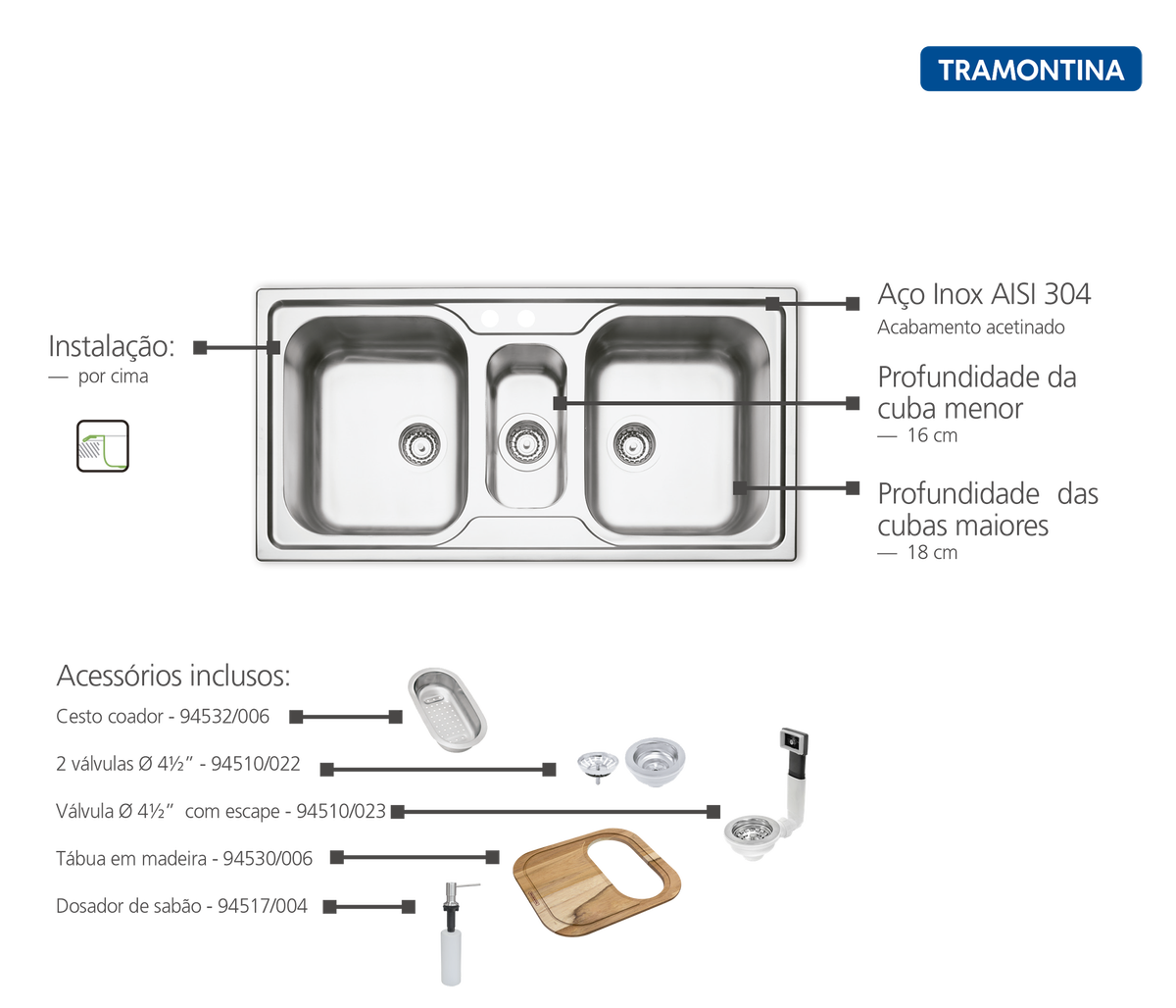 | Profundidade da cuba | 18 cm + 16 cm |