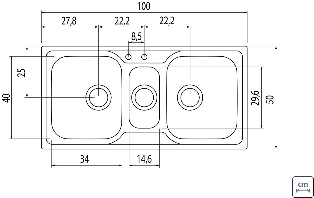 - Cubas das extremidades: 18 cm de profundidade