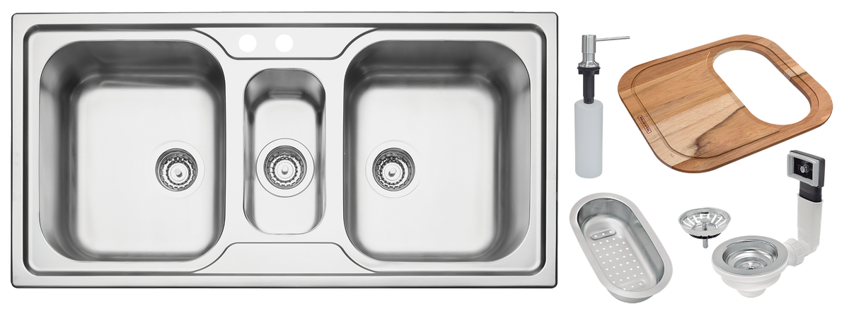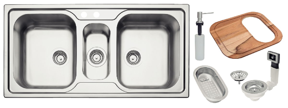 Cuba de Sobrepor Tramontina Marea 2.5C 34 em Aço Inox com Acabamento Acetinado 100 x 50 cm e com acessórios Válvula, Dosador, Tábua e Cesto