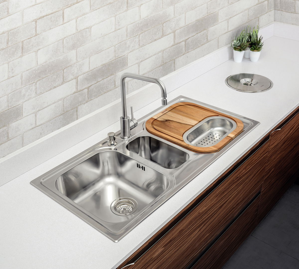 | Acessórios inclusos | - Kit de instalação - 2 Válvulas 4 1/2'' - 1 Válvula 4 1/2'' com escape - Tampão para furo de torneira - Tábua em madeira - Cesto Coador - Dosador de sabão |