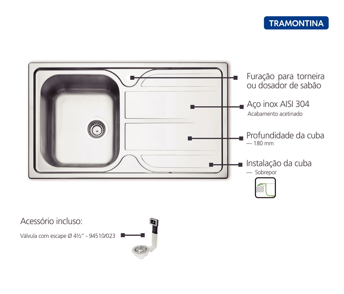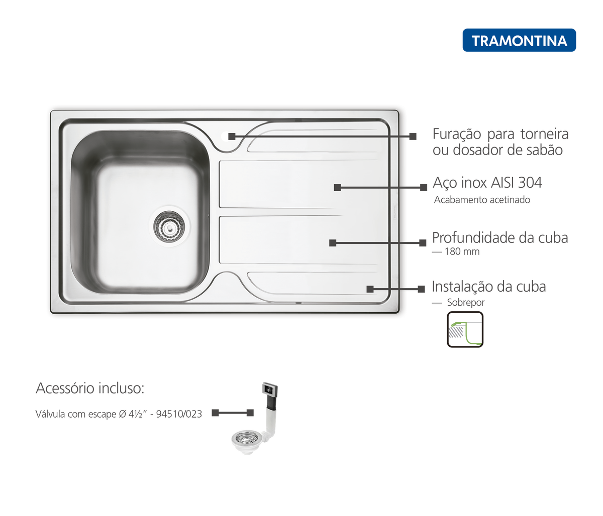 Para você ter mais facilidade em suas tarefas na cozinha, a Cuba de Sobrepor Tramontina Marea 34 Cuba a Esquerda em Aço Inox com Acabamento Acetinado 86x50 cm é a ajudante perfeita! Um item prático e de fácil limpeza produzido em aço inox com acabamento acetinado, que além de tudo vai te garantir alta durabilidade e resistência. Sua cuba localizada à esquerda, possui 18 cm de profundidade e acompanha válvula de 4 1/2'' (polegadas) de diâmetro com escape e 01 furo para torneira. Um item indispensável para quem preza sempre pelo melhor!