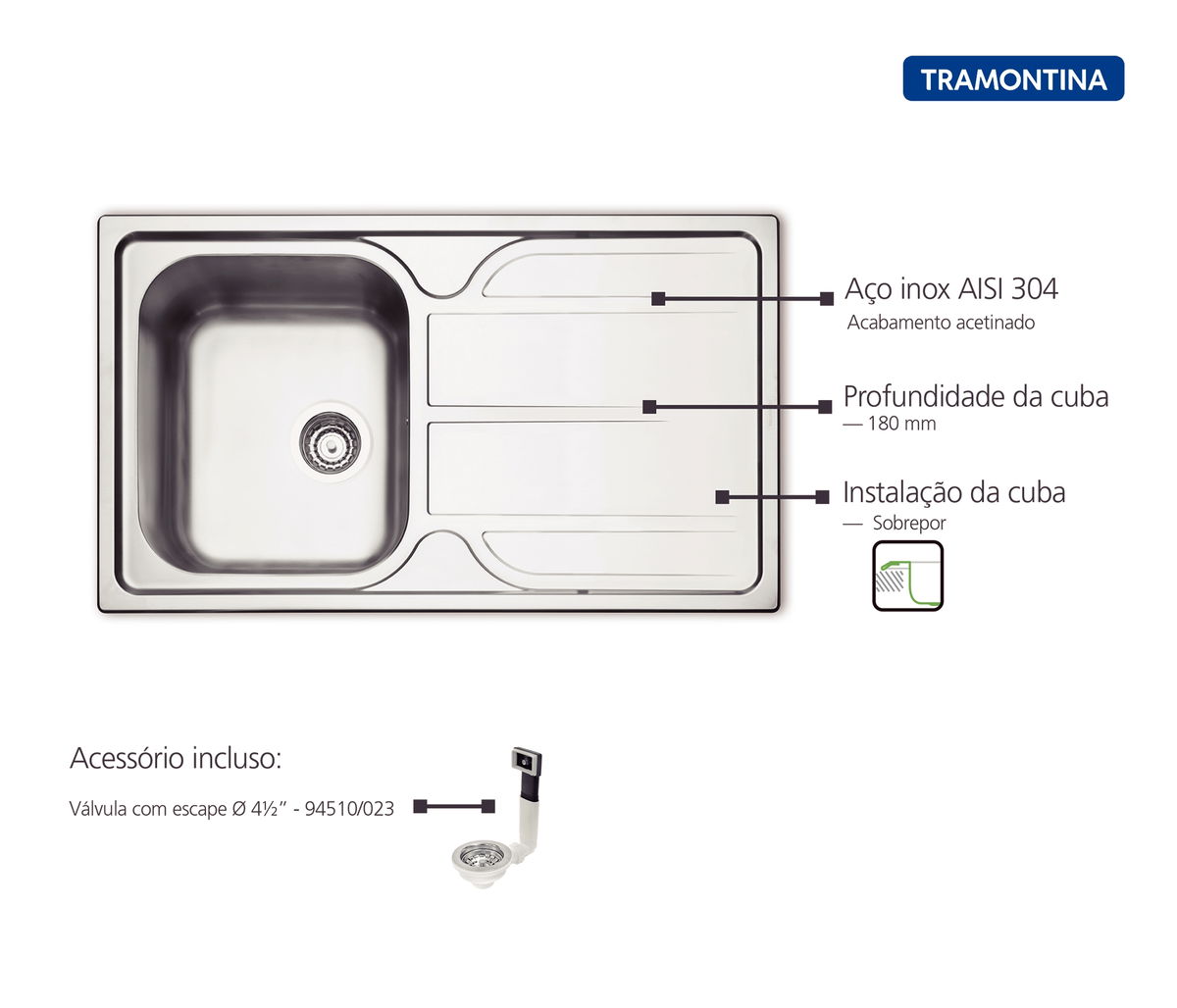 A Cuba de Sobrepor Tramontina Marea em Aço Inox com Acabamento Acetinado, 86 x 50 cm com Escorredor e Válvula, da linha Prime, possui design robusto com linhas retas que garantem durabilidade.