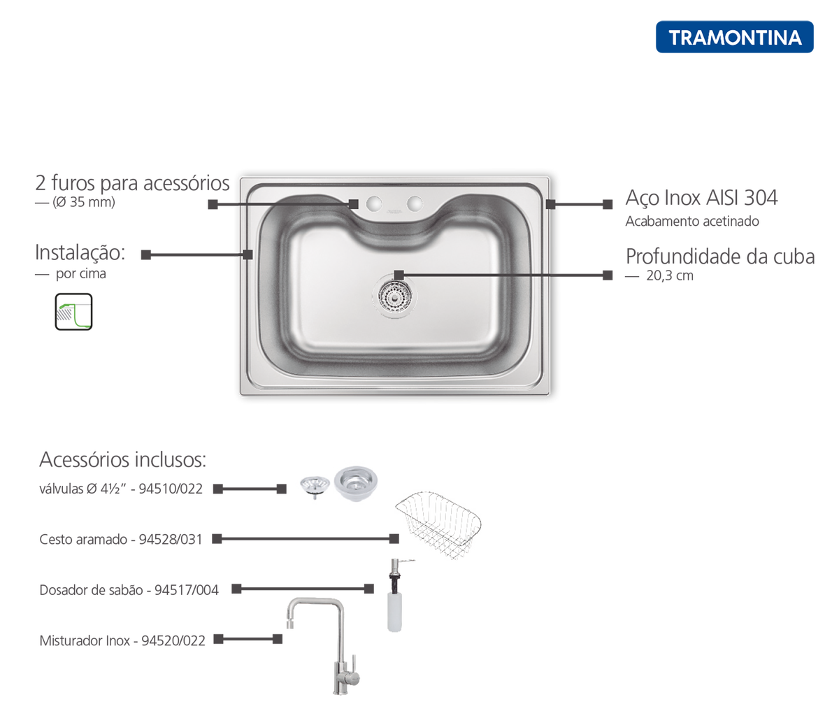 | Acessórios inclusos | - Kit de instalação - 1 Válvula 4 1/2 - Cesta Aramada - Dosador de sabão - Misturador Angolare |