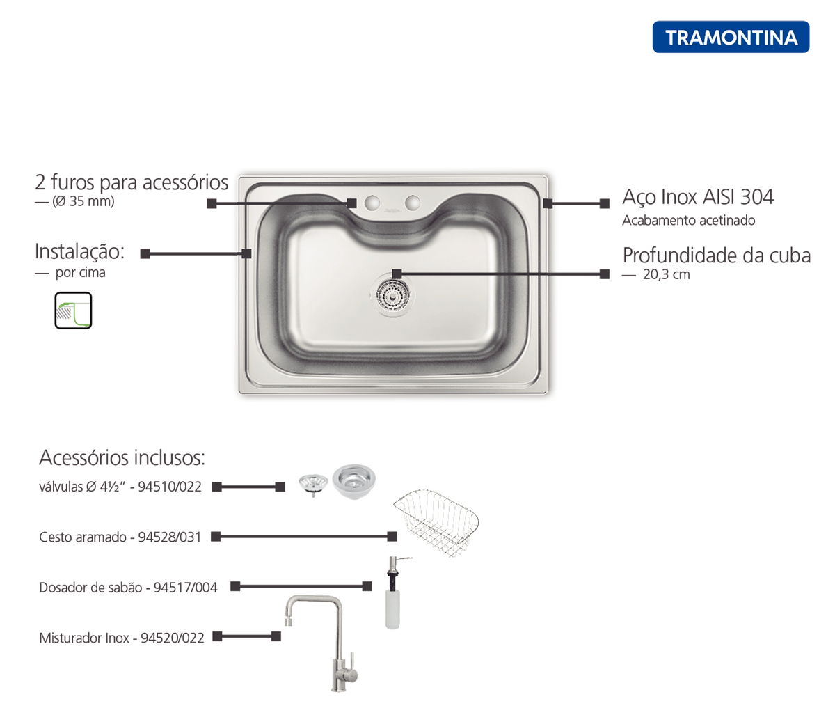 Cuba de Sobrepor Tramontina Morgana 60 FX em Aço Inox com Acabamento Acetinado com Misturador Válvula Dosador de Sabão e Cesto 69x49 cm vai dar uma cara nova à sua cozinha. Produzida em aço inox com acabamento acetinado, é um item super prático e versátil, pois é fácil de limpar e agrega requinte em todos os momentos do seu dia. Com os itens Tramontina você demonstra todo seu cuidado com o coração da sua casa!