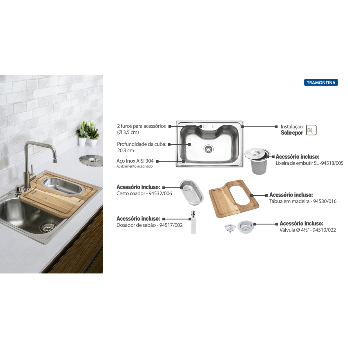 Cuba de Sobrepor Tramontina Morgana em Aço Inox 69 x 49 cm com Lixeira de Embutir 5 L Tábua de Madeira Dosador de Sabão Cesto Coador e Válvula