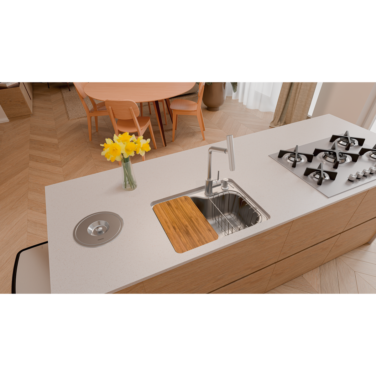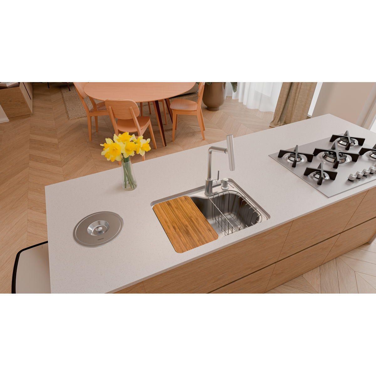 Cuba Tramontina Morgana Compact 48 FX Undermount em Aço Inox com Acabamento Escovado com Dosador de Sabão, Tábua e Cesto Aramado