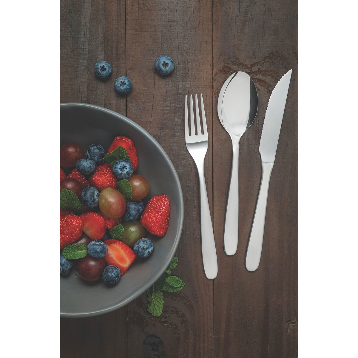 Peças totalmente feitas de aço inox, altamente duráveis, mantêm suas características originais, preservando a beleza, a higiene e a durabilidade do material. Colheres com bojo em formato simétrico e bordas cuidadosamente arredondadas. Garfos com dentes polidos na parte interna, com formato apropriado para a boca e bordas arredondadas para proporcionar maior conforto no uso. Facas totalmente temperadas, que garantem maior durabilidade no fio de corte e maior resistência à corrosão, e por suas características de temperabilidade, não riscam as porcelanas. Acabamento em brilho, com detalhes no cabo. Próprias para uso diário combinam com qualquer ambiente. Podem ser lavadas diariamente na máquina de lavar louças.