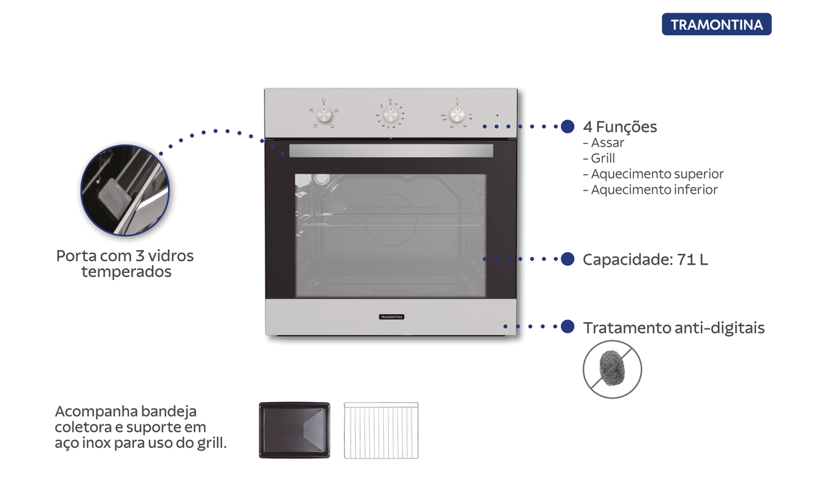 - Material em Aço Inox: Durabilidade e resistência, com acabamento anti-digitais para manter seu forno sempre impecável.