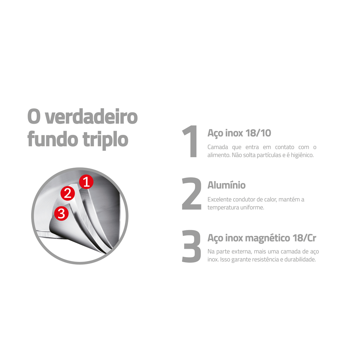 Economiza tempo e energia: o segredo está no fundo triplo (aço inox + alumínio + aço inox), que distribui o calor uniformemente, proporcionando um cozimento mais rápido. Por isso, você pode manter o fogo baixo durante todo o preparo e, assim, poupar energia. Além disso, a caçarola toda em aço inox pode ir ao forno para gratinar ou finalizar pratos, na temperatura máxima de 260°C.