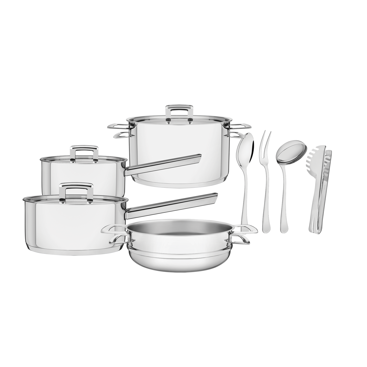 Jogo de Panelas Tramontina Brava em Aço Inox com Fundo Triplo 4 Peças com Kit de Utensílios 4 Peças