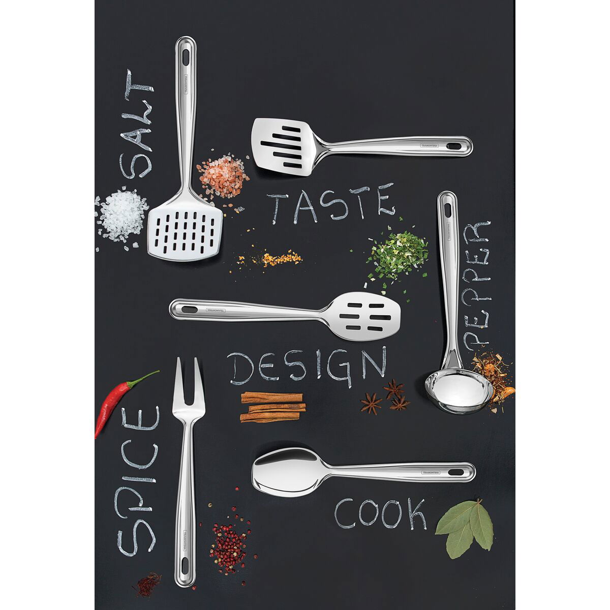 Totalmente feitos de aço inox, por isso não solta nenhum resíduo nos alimentos, mantendo-os saudáveis. Altamente durável, mantém suas características originais, preservando a beleza, a higiene e a durabilidade do material. Possuem furo no cabo, o que permite incluí-la na decoração da cozinha. Podem ser lavados diariamente na máquina de lavar louças.
