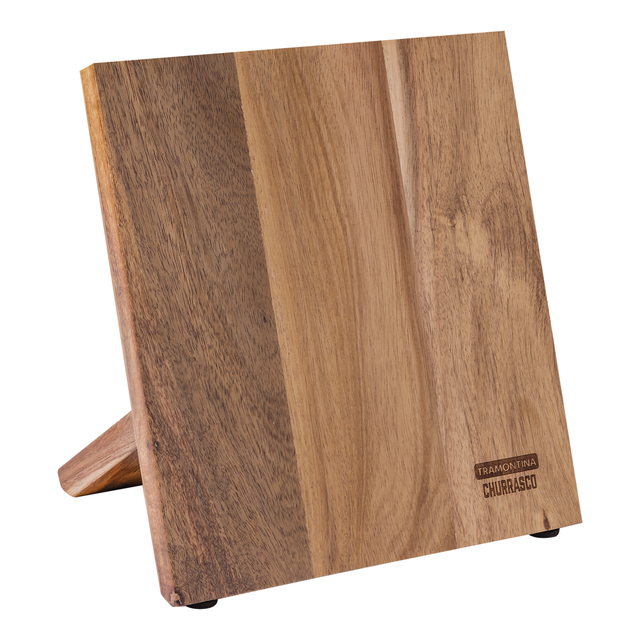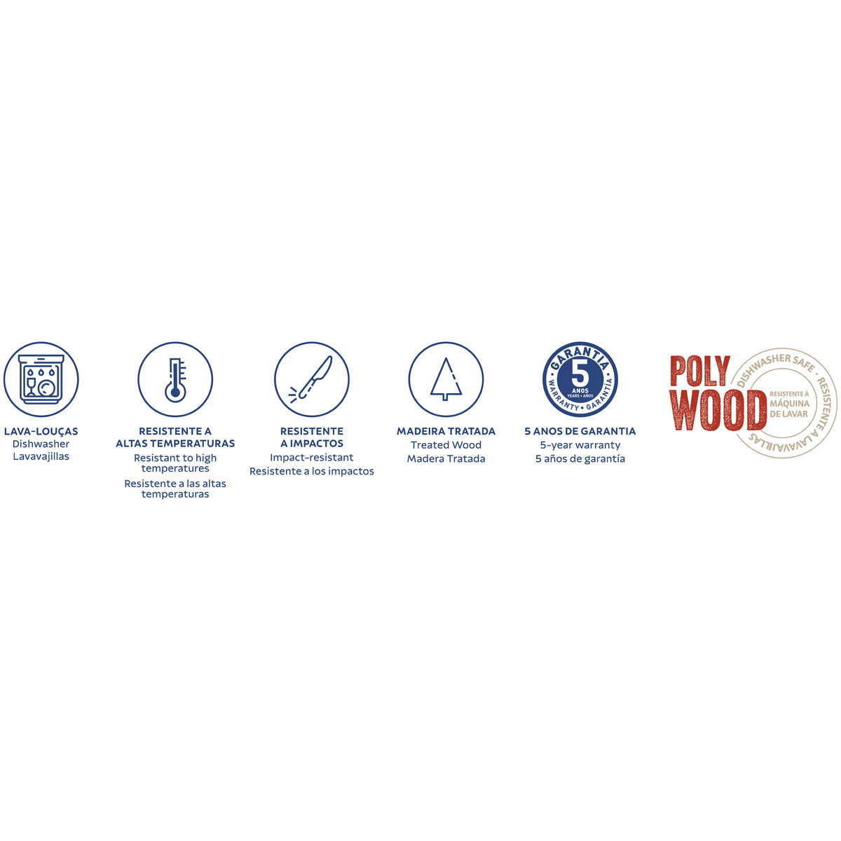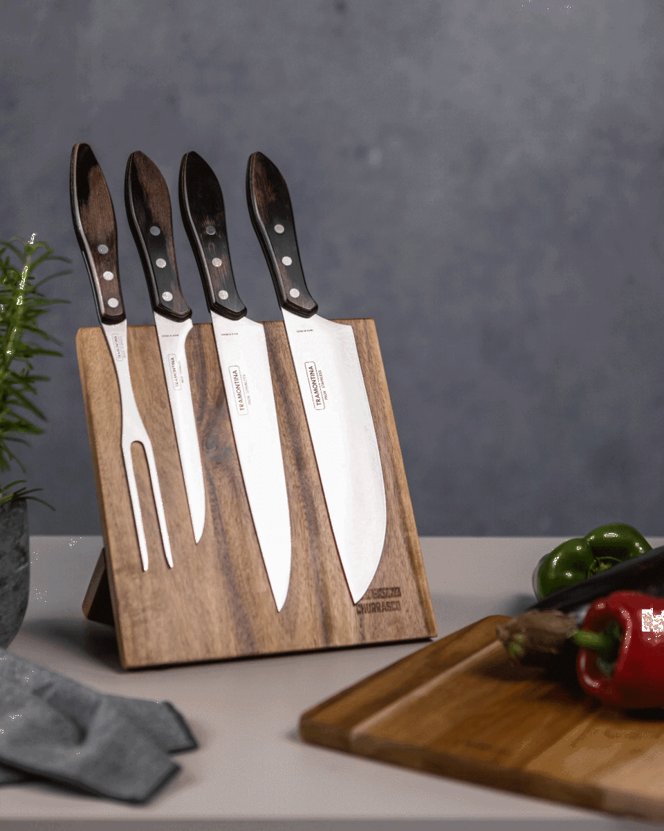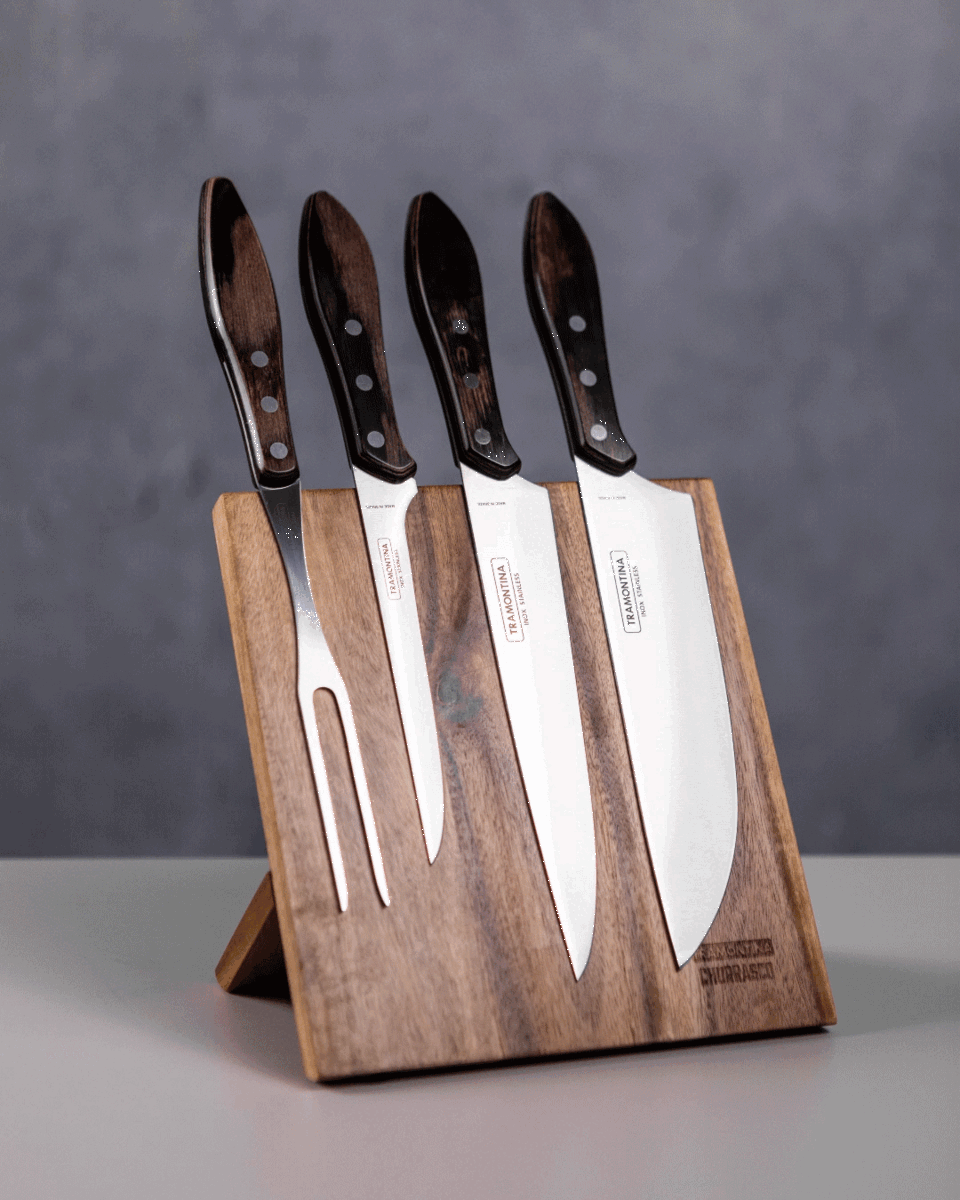 Lâminas de aço inox. As lâminas das facas têm maior durabilidade do fio devido ao tratamento térmico. A lâmina do garfo conta com maior espessura e uma estampagem do aço que garante maior resistência, evitando deformações. Os cabos de madeira tratada Polywood são resistentes à impactos e alta temperaturas garantindo maior resistência e durabilidade. Rebites de alumínio. Suporte de madeira magnético. Podem ir à máquina de lavar louças facilitando seu dia a dia.
